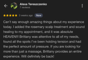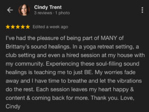 “I was fairly new to most of the practices (Yoga, sound healing, mantra) Brittany was able to encourage me to try. She is very patient and knowledgeable, a natural teacher. Her passion & love for healing is beautiful to witness.”-Tiffany